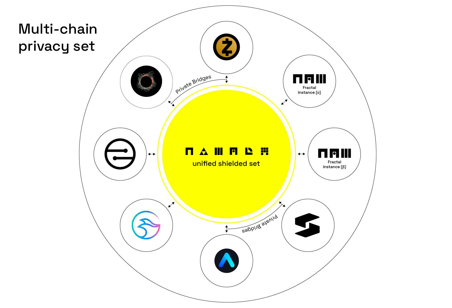 在以太坊(L1 和 L2)等平台上,个人使用支持不同可替代代币(ETH、USDC、DAI)的隐私 dApp(Tornado Cash 或 ZK Money),隐私集按应用程序和资产划分:有一个私有ETH -ZK Money 套装和 ETH-Tornado Cash 套装。如果将这两个 dApp 组合起来,这两个 dApp 的用户将获得更好的隐私。隐私设置也与平台绑定:以太坊上的私有 USDT 不能与 Near(或任何发行 Tether 的平台)上的私有 USDT 结合。这也适用于具有私有执行环境(如 Aleo 或 Espresso)的 L1,其中这些私有平台内的应用程序共享隐私集,但不能跨平台,例如 Aleo 和 Espresso 之间,或 Aleo 和以太坊之间。
