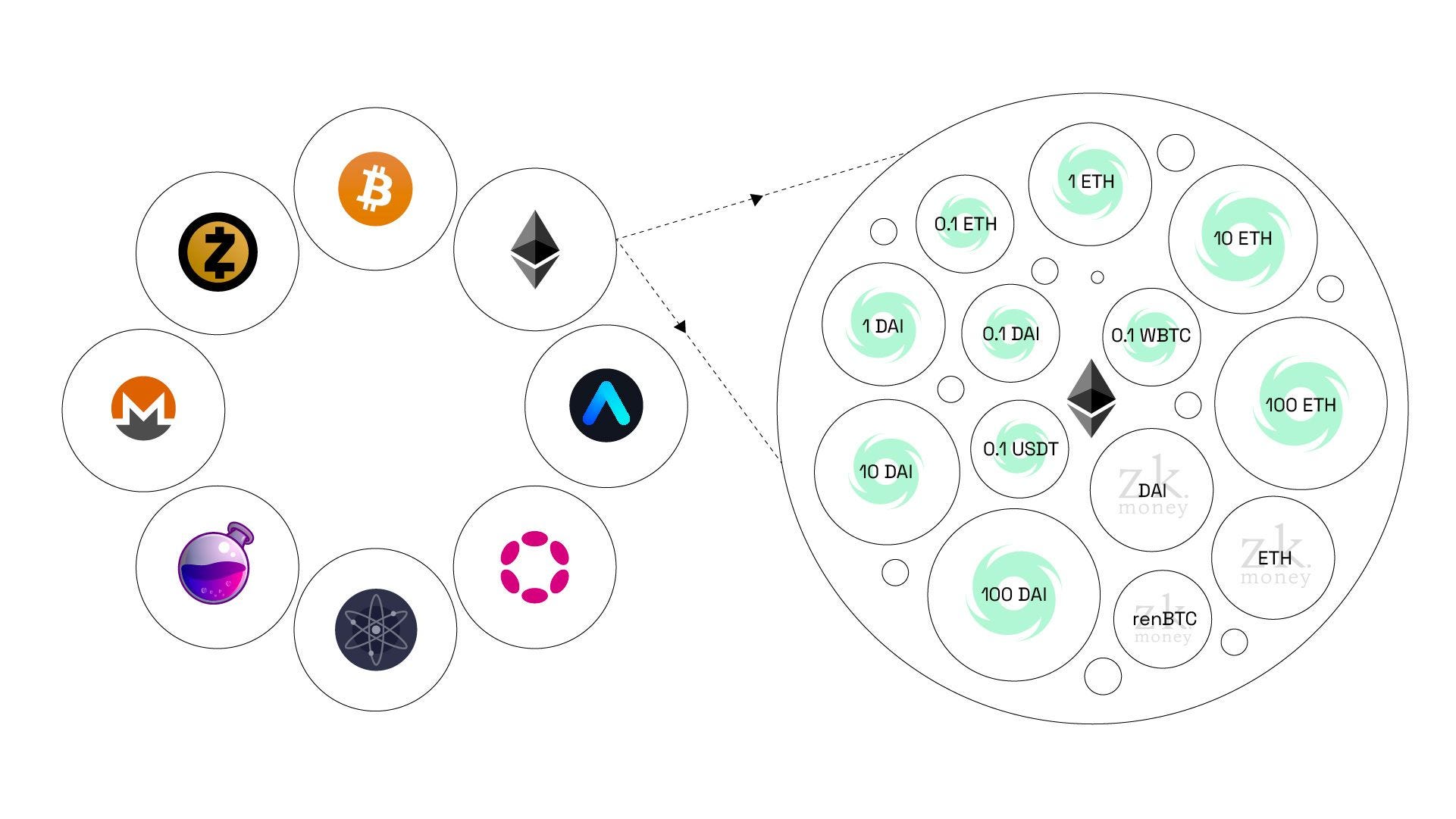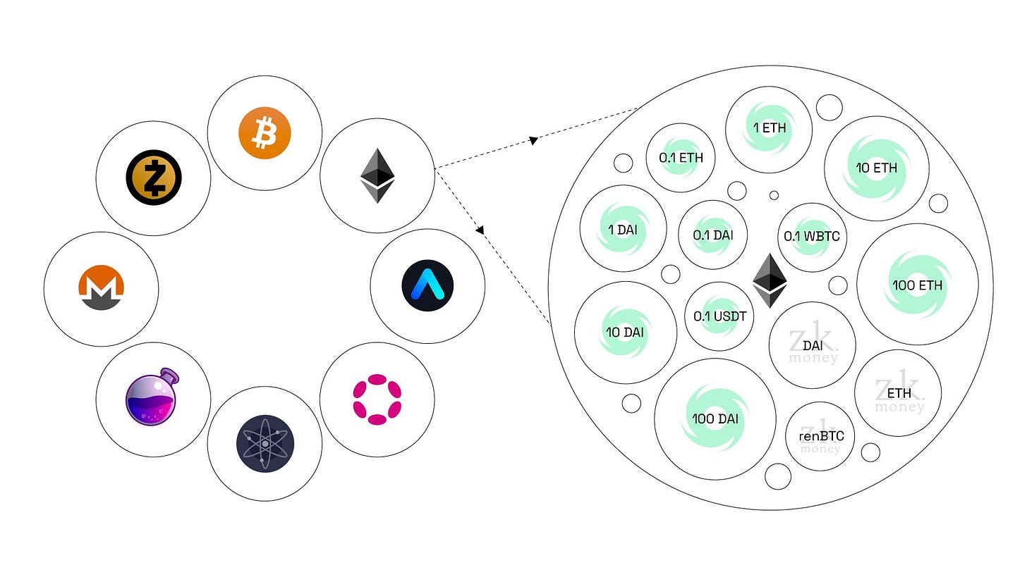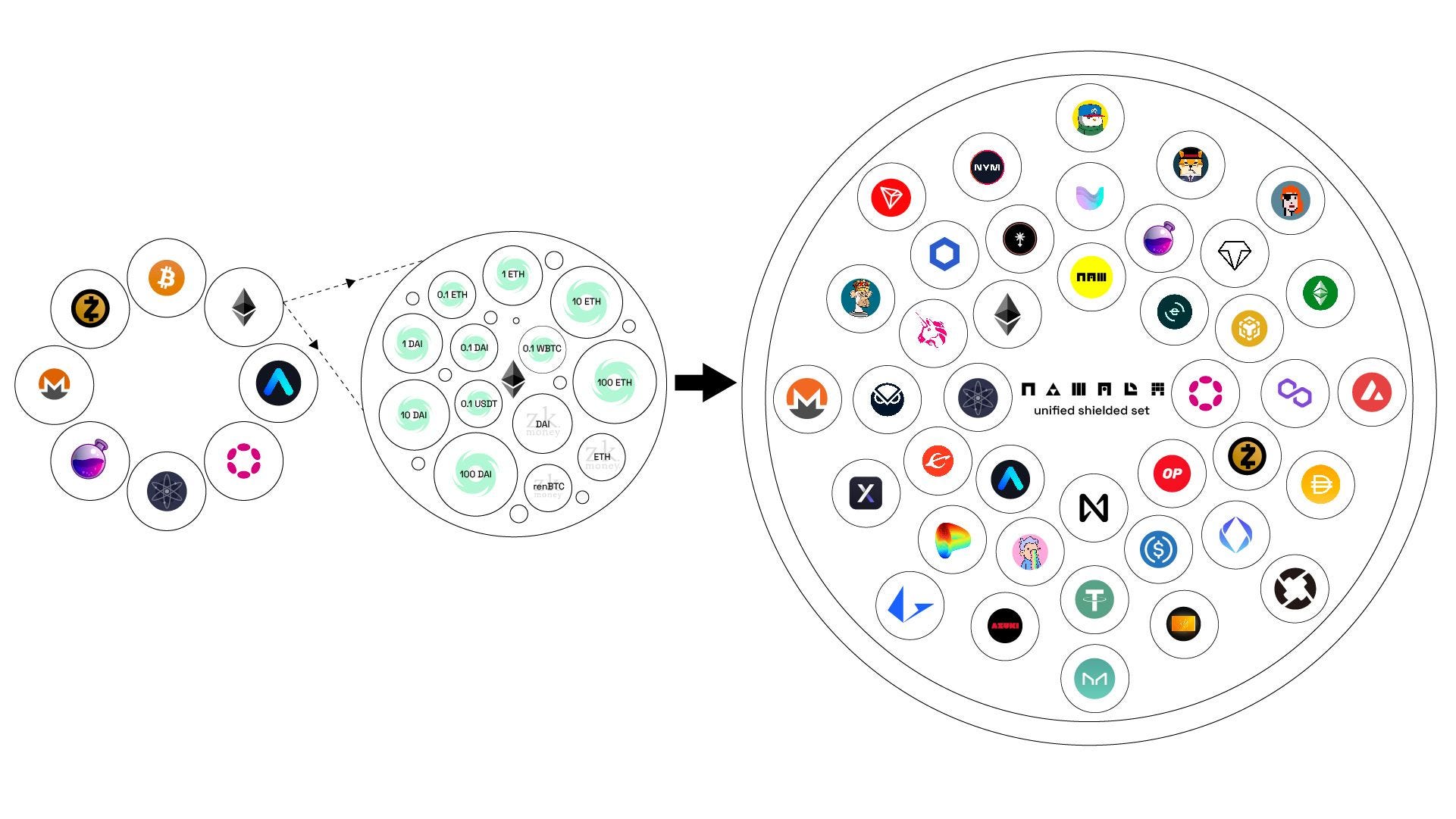 如今的隐私被代币、应用程序和平台所分割。在 Zcash 或 Monero 等加密货币协议中,Zcash 隐私集与 Monero隐私集是脱节的。这是隐私与特定货币(ZEC 和 XMR)绑定的结果——个人在不使用其本国货币的情况下无法使用各自的隐私功能。另外,隐私集的大小仅限于既想要 隐私保证又想要 Zcash 或 Monero 提供的货币政策的个人的交互。