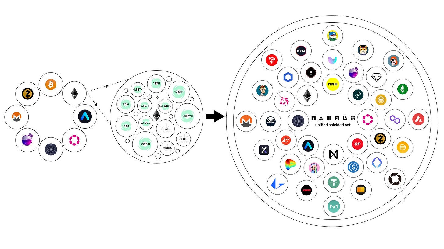 Namada 旨在解决隐私集的隔离问题。首先,它为任何可替代代币和不可替代代币创建一个与资产无关的屏蔽池。其次,通过将资产与平台解耦并使它们能够转移到统一的隐私集来消除平台的碎片化。