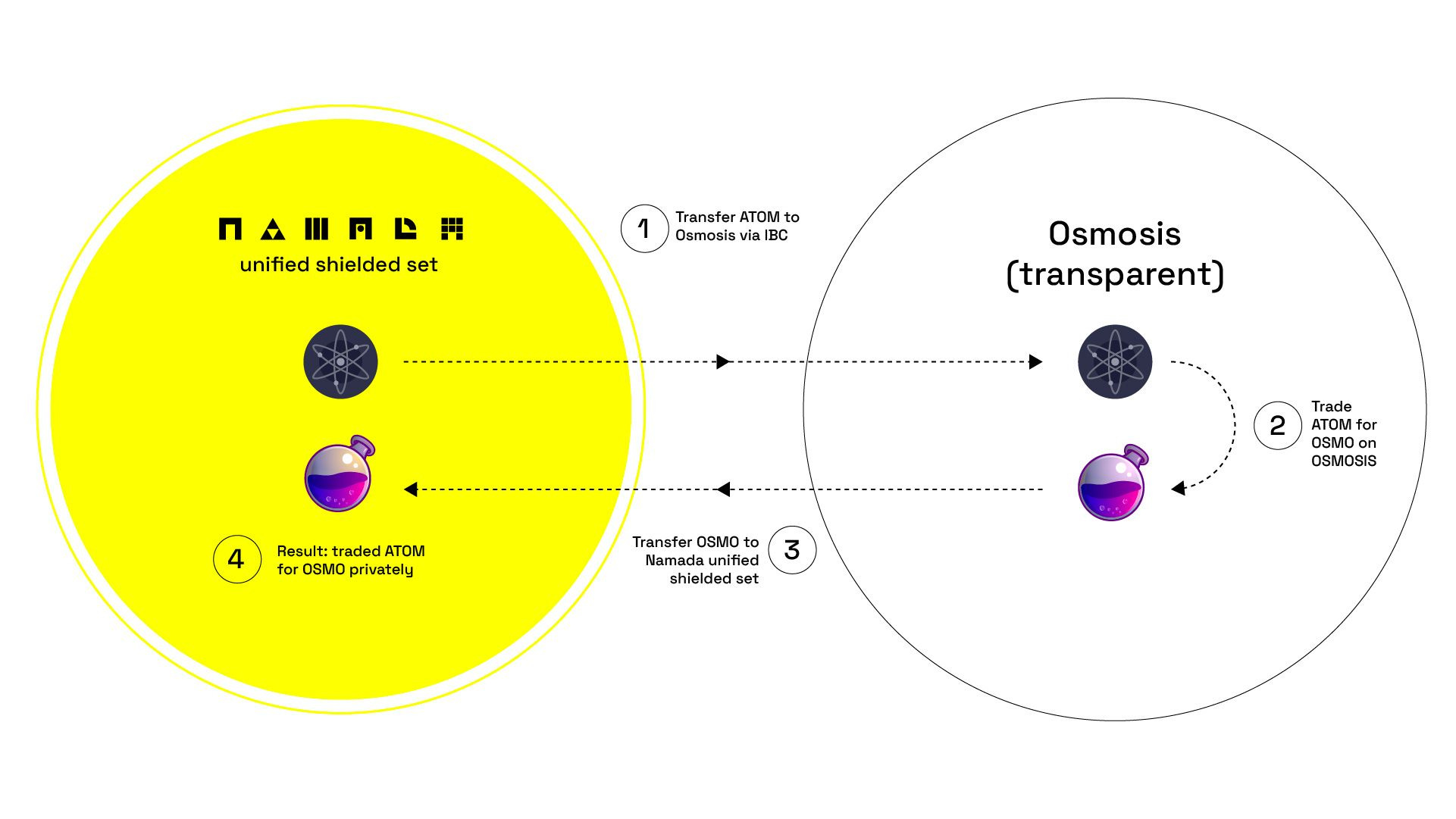 在 Osmosis 等特定应用链上,用户可以私下用 ATOM 换取 OSMO。在 Namada 上,用户签署一系列自动触发的操作: