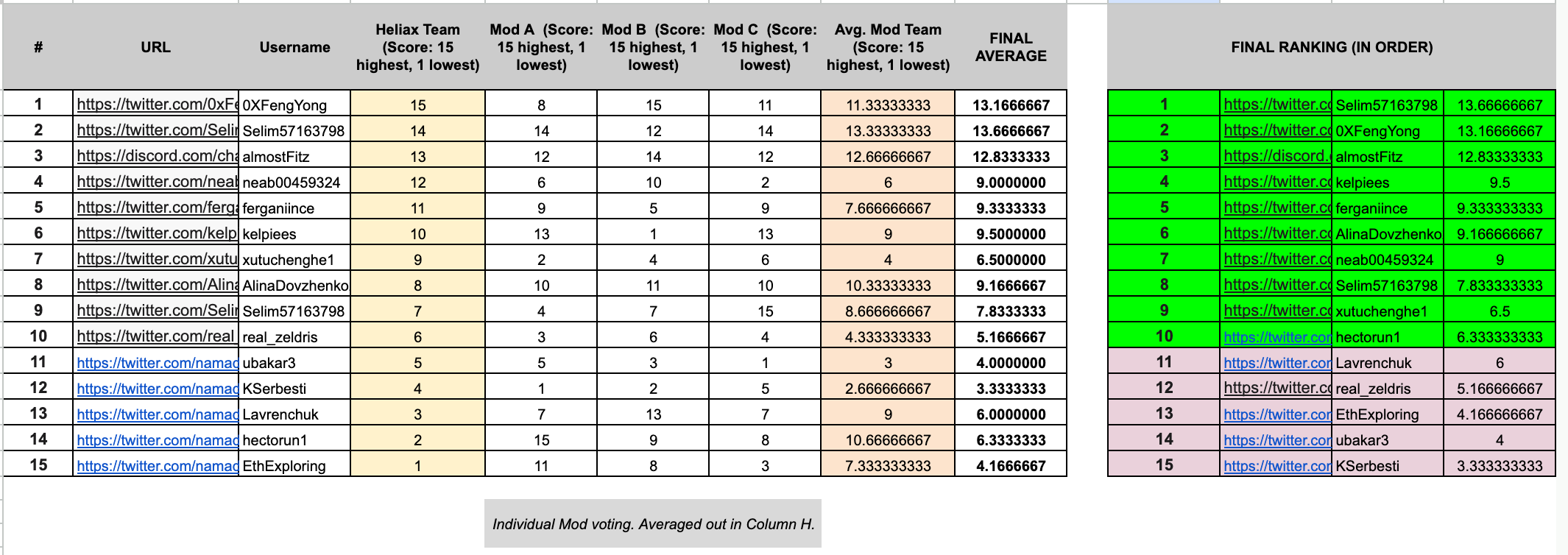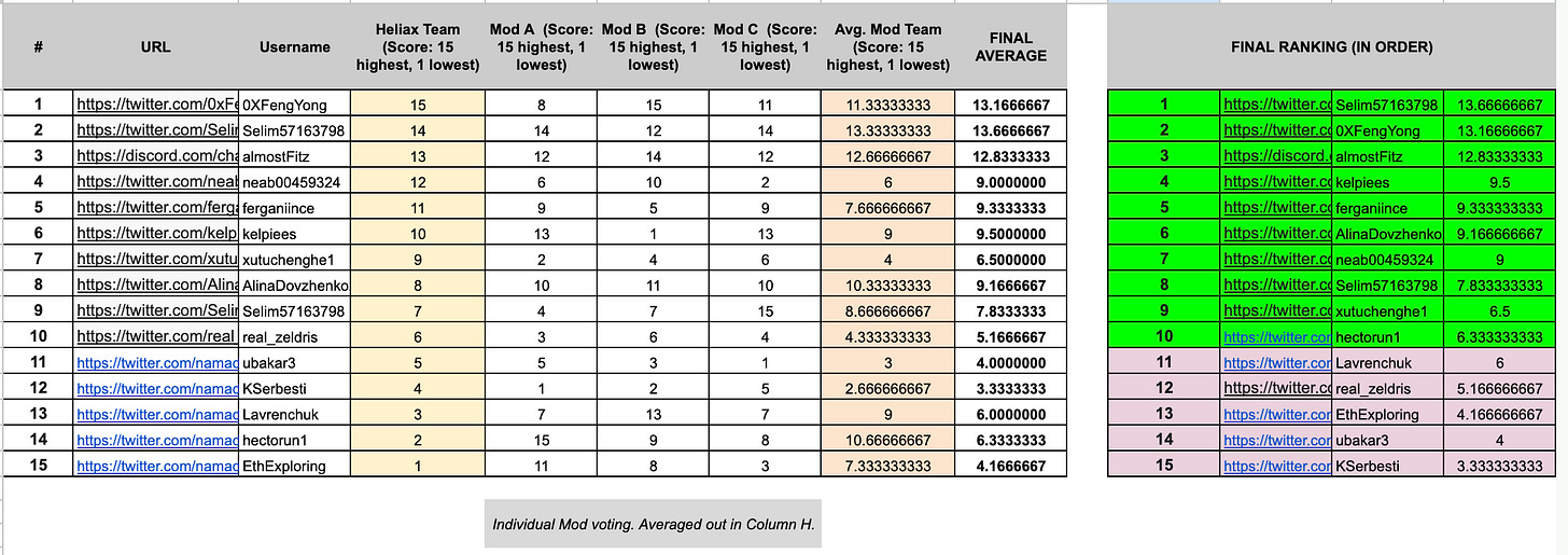 注:在观察社区投票 Twitter 线程上异常高的点赞和转发后,根据 Namada Discord 版主团队和 Heliax 团队之间 50/50 的投票选出前 10 名获胜者(完整计算请参见最后)本文的内容)。